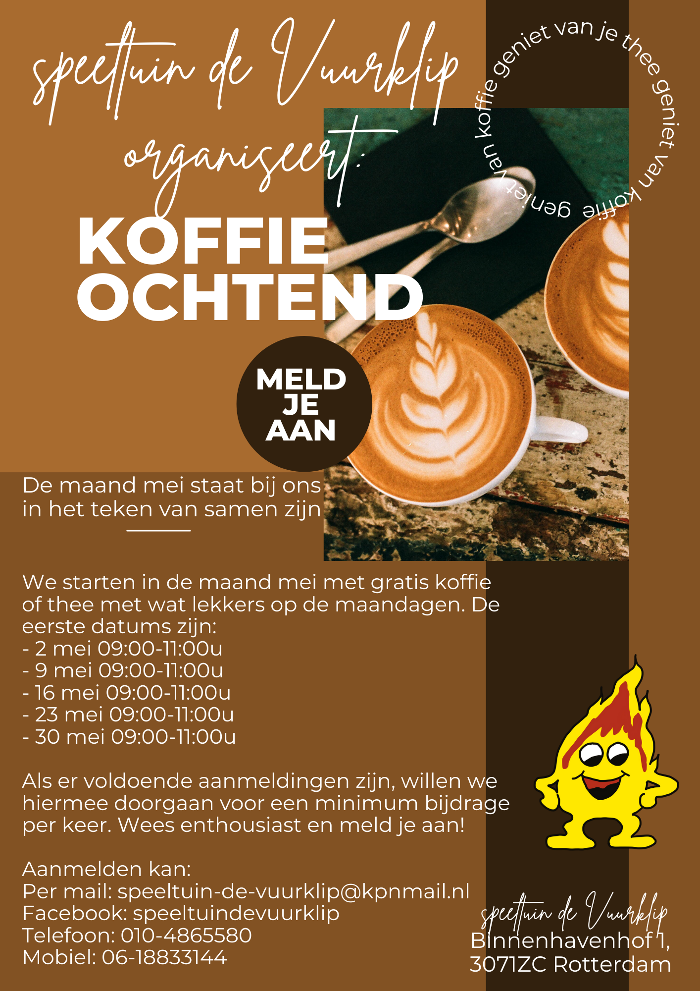 Speeltuin de Vuurklip organiseert in de maand mei 5 maandagen een koffieochtend met lekkers. De eerste datums zijn: